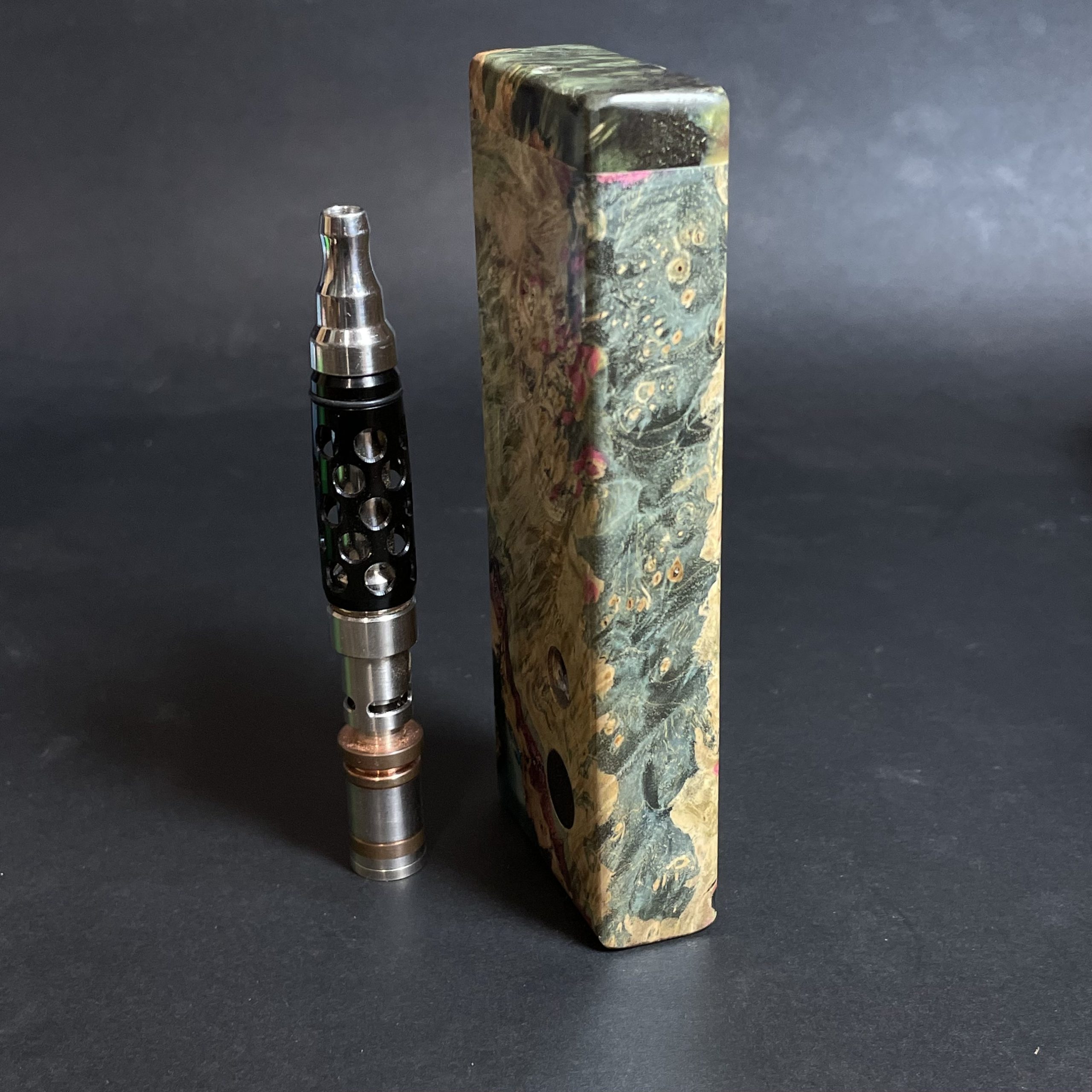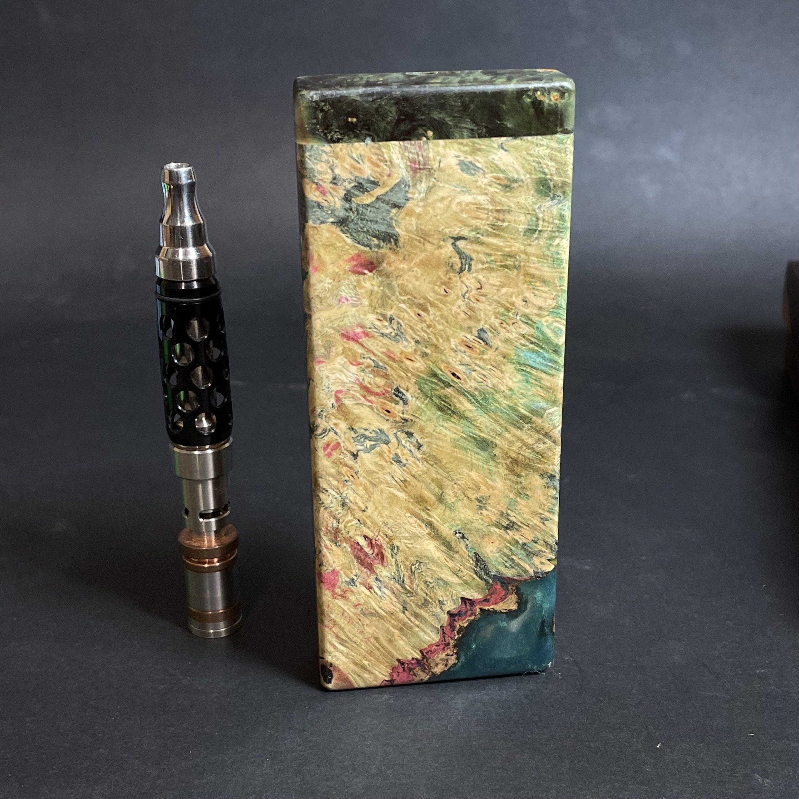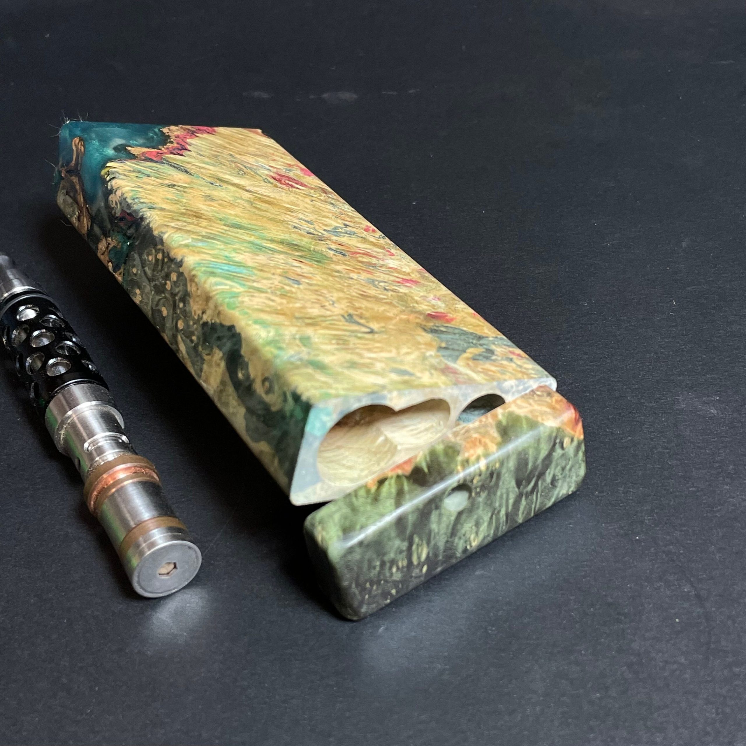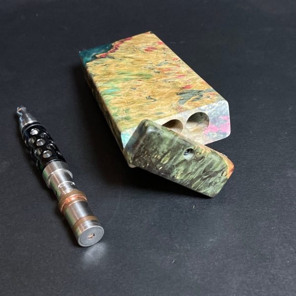 Futo Galaxy Burl Stashes are out of this world stabilized burl wood with resin cast accents. The stabilization process hardens the burl wood and if dyes are added brings out amazing natural patters in the wood – some times they look cosmic in origin.