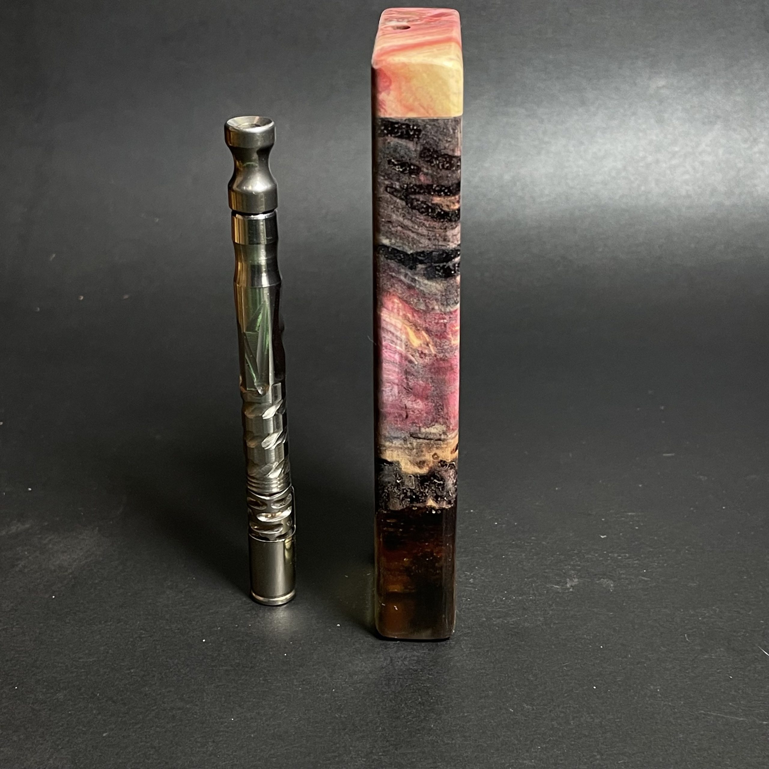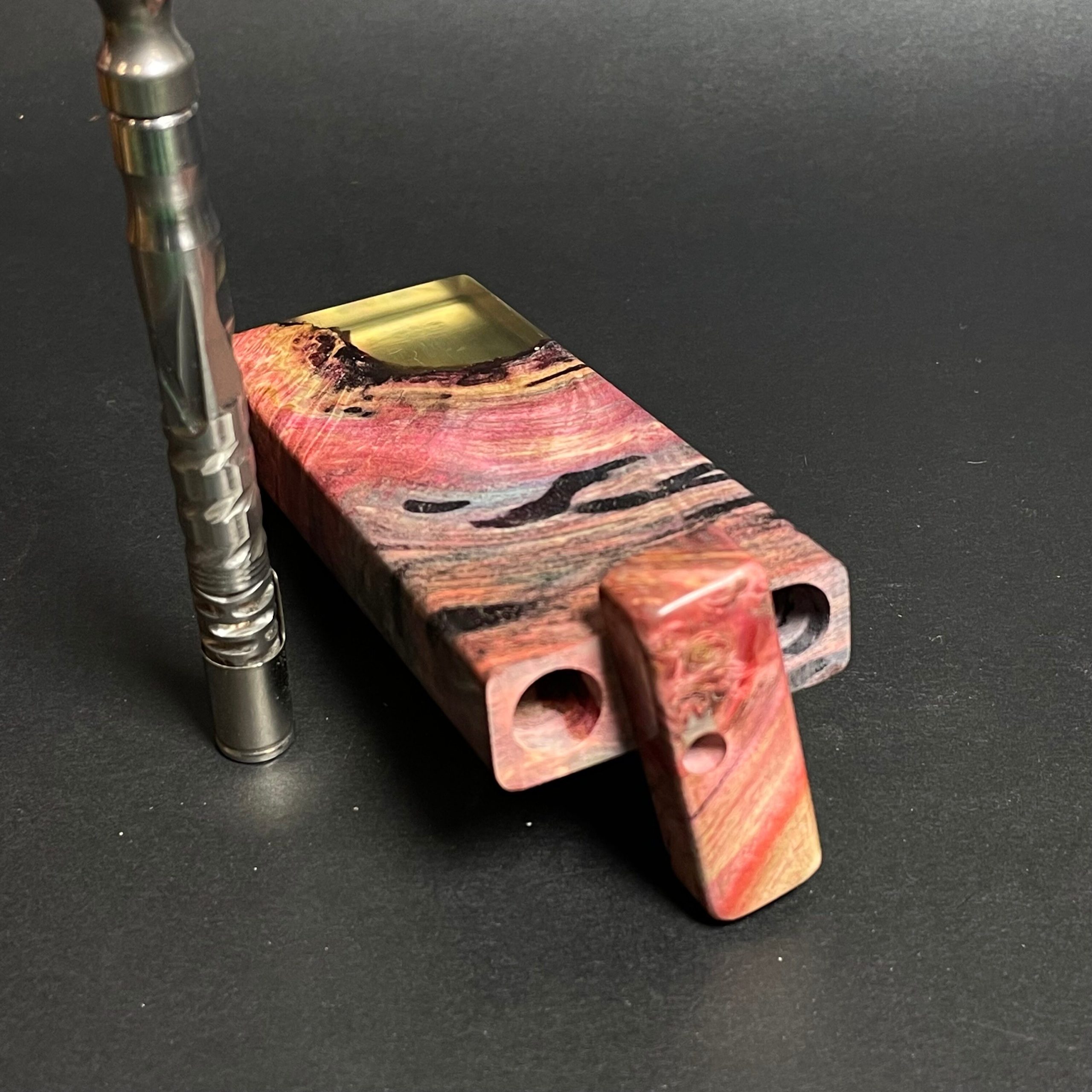 Futo Galaxy Burl Stashes are out of this world stabilized burl wood with resin cast accents. The stabilization process hardens the burl wood and if dyes are added brings out amazing natural patters in the wood – some times they look cosmic in origin.