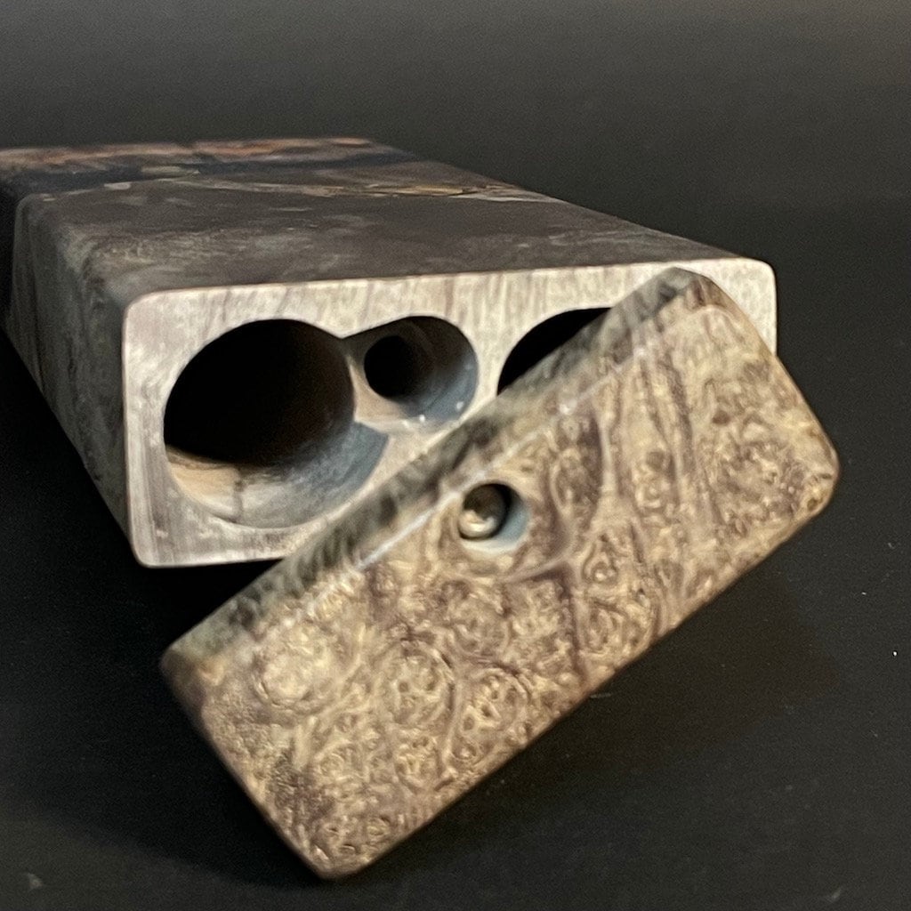 Experience the artful fusion of natural elements with our Futo Galaxy Burl Stashes. Each stash, featuring stabilized burl wood complemented by resin cast accents, captures the essence of the wood’s natural design. The addition of dyes to the stabilization process brings out patterns reminiscent of cosmic landscapes. Our FutoStash line presents a limited series of numbered pieces, each highlighting the beauty of nature in a unique and artistic form.