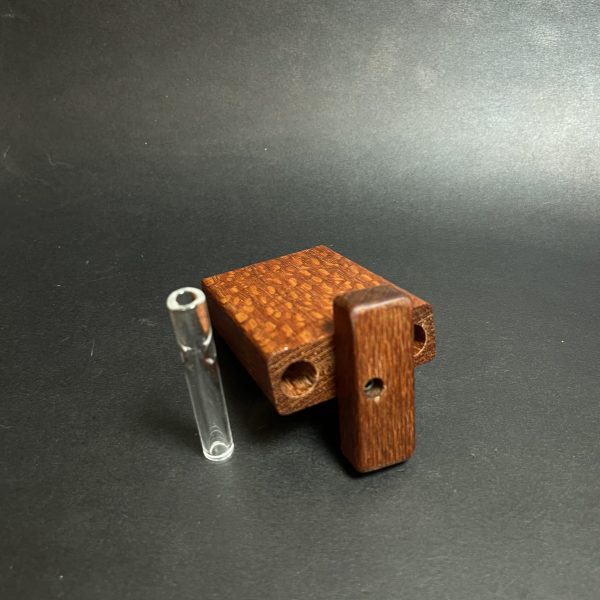 We include a short clear glass 8mm (0.31″) one hitter, custom ground with a bevel to make loading it with herb easy, you just push and twist.