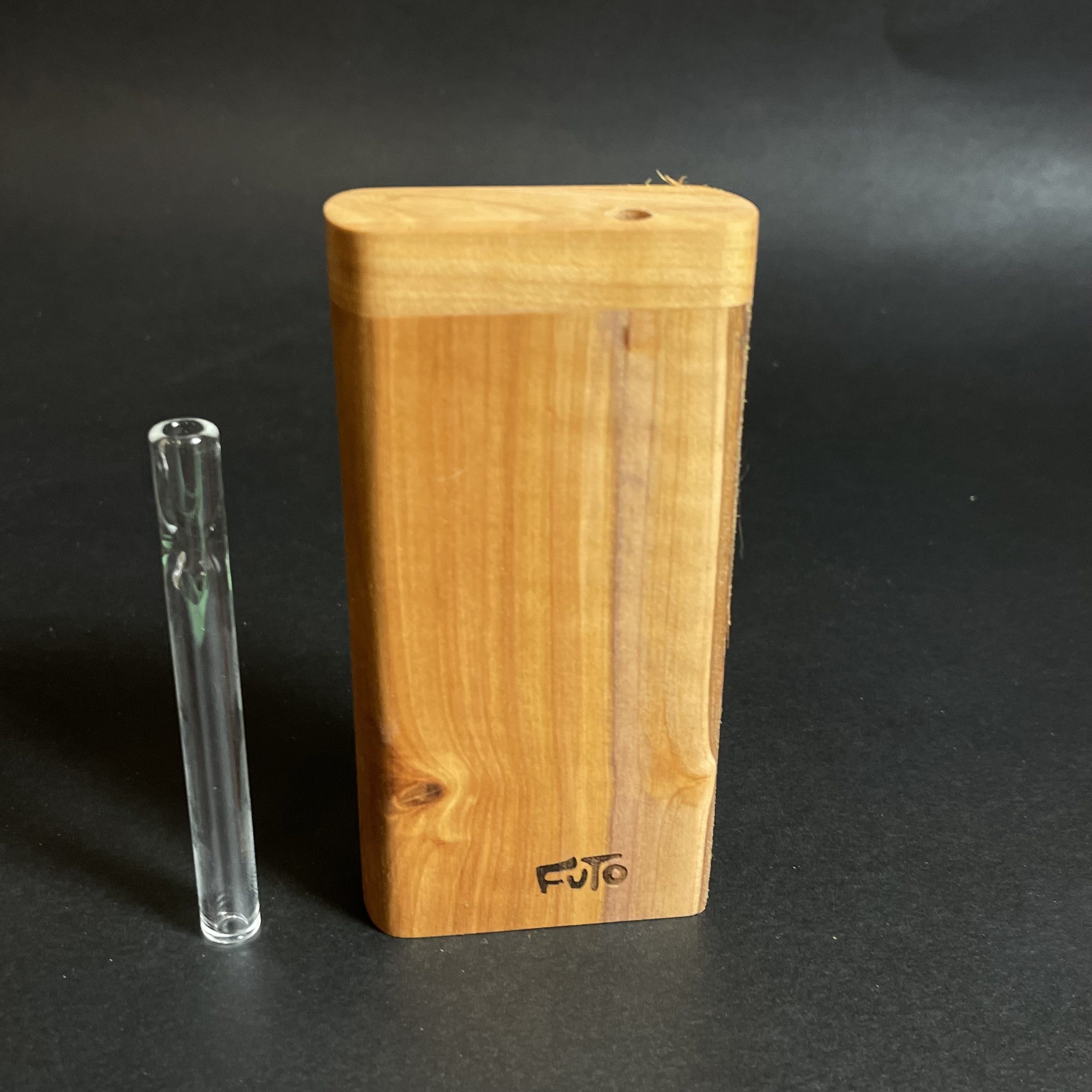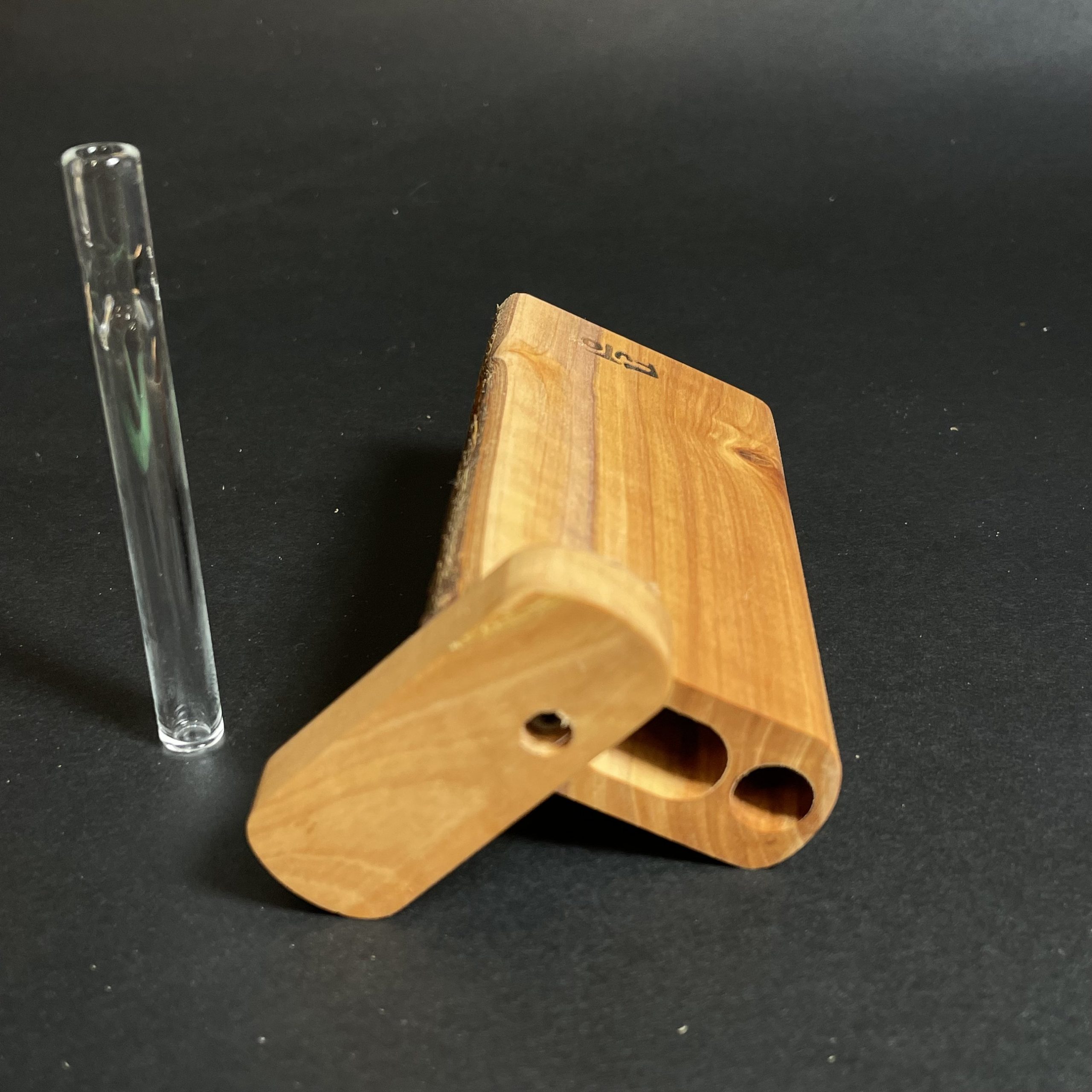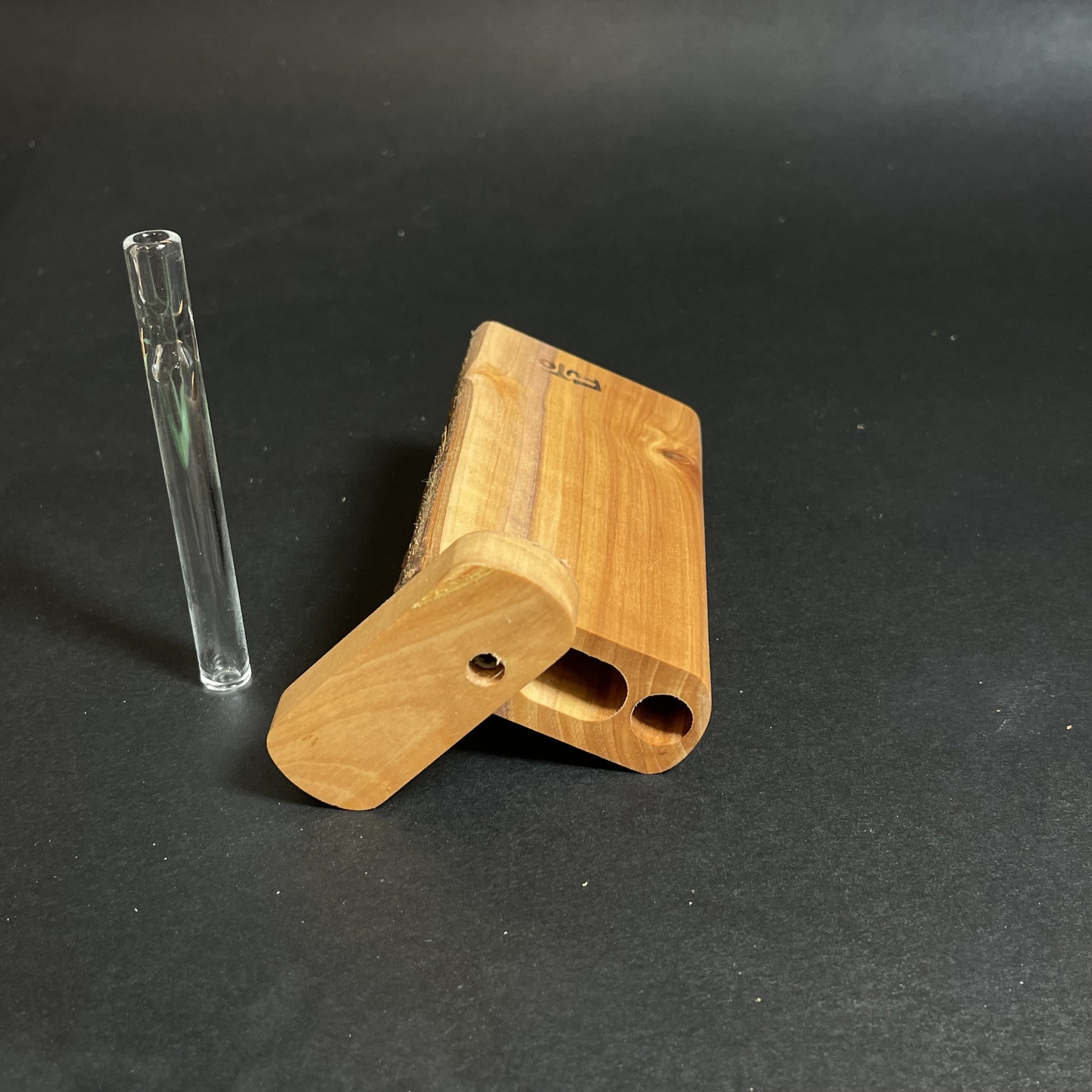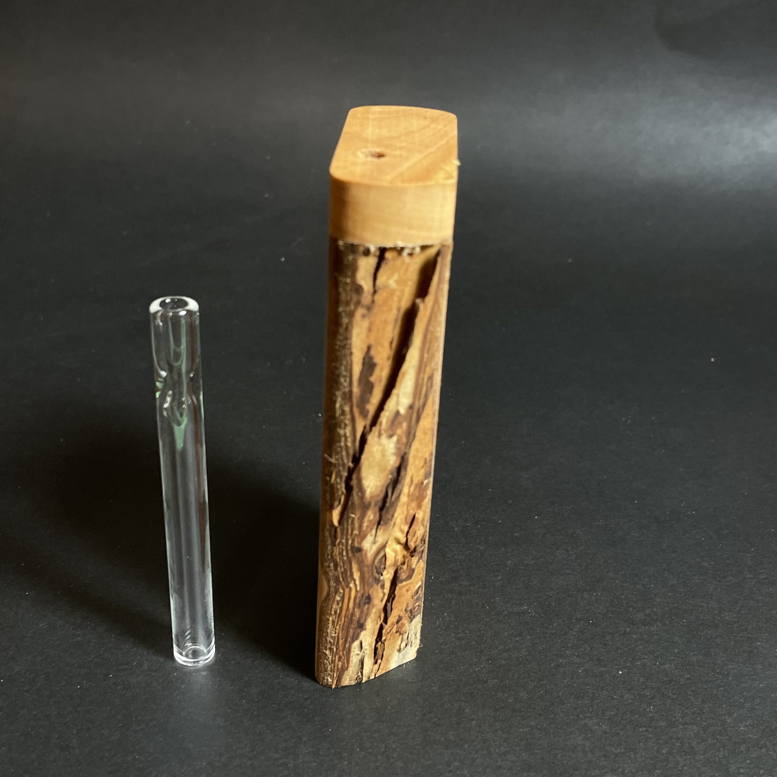 A slim live edge case for herb with an 8mm clear glass one hitter made by Futo.